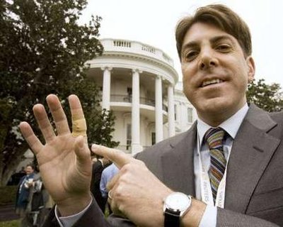 路透社記者德克伸出被美國(guó)總統(tǒng)布什的愛(ài)犬巴尼咬了一口的食指。