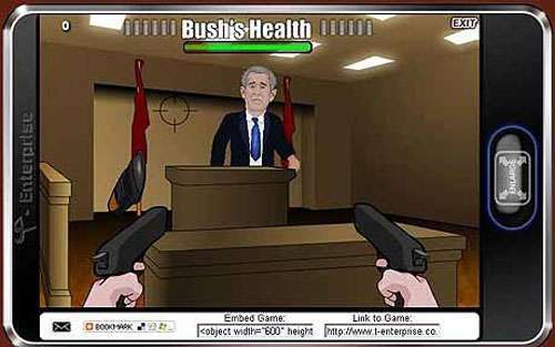 據(jù)了解,《布什靴營》的玩家可扮演一名保安特工,玩家必須在突然擲出的鞋擊中總統(tǒng)之前開槍把鞋擊落。玩家們只要滑動鼠標,瞄準槍上的十字絲,然后開火就行了。每次布什總統(tǒng)誤中槍火或被鞋子擊中,他的“生命”便會減少。當生命減至零時玩家便輸了。