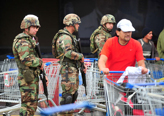雖然智利政府已開始免費發(fā)放食品,但由于大規(guī)模救援遲遲未能展開,2月28日和3月1日,康塞普西翁兩度發(fā)生大規(guī)模哄搶現(xiàn)象,搶掠者甚至放火燒了一家超市。