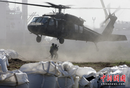 美軍出動黑鷹直升機(jī)空投了一噸沙袋在海岸,以保護(hù)美國南部濱海區(qū)重要的濕地。