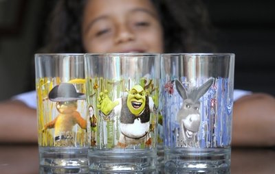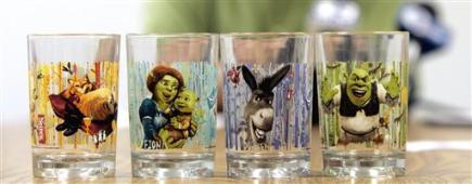 這種玻璃杯1個(gè)售價(jià)為2美元,杯身印有電影《怪物史萊克4》中的角色形象,一共有4款。杯子一杯可盛16盎司飲料。