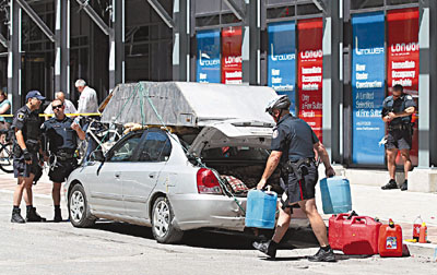 中新網(wǎng)6月26日電 據(jù)香港《文匯報(bào)》26日報(bào)道,G20峰會(huì)前夕,各成員國領(lǐng)袖陸續(xù)抵,加拿大警方在多倫多市采取極嚴(yán)密保安措施。連日來已有3名可疑人士被捕,其中1名53歲男子前日駕車經(jīng)過峰會(huì)會(huì)場禁區(qū),由于車頂綁著1個(gè)鋼制儲(chǔ)物箱,模樣怪異,引起警方注意。警察攔車檢查,赫然發(fā)現(xiàn)車上有十字弓、電鋸、棒球棍、大錘外,還有多種不明液體。警方?jīng)]收這批物品,并將他拘捕。