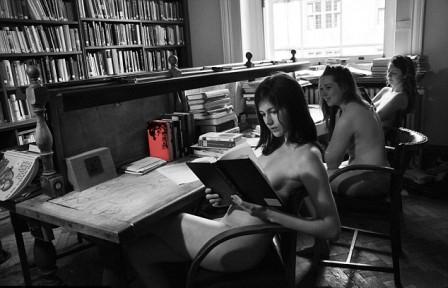 8月號(hào)的掛歷上,則是一組女學(xué)生在圖書(shū)館中讀書(shū),她們巧用書(shū)本遮蓋自己的隱私處。