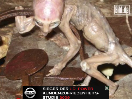 中新網(wǎng)8月27日電 據(jù)“歐洲時(shí)報(bào)網(wǎng)”26日援引德國(guó)《圖片報(bào)》8月24日?qǐng)?bào)道,墨西哥電視臺(tái)近日公布了一條令人難以置信的消息,2007年5月在該國(guó)的一個(gè)農(nóng)場(chǎng)內(nèi),人們?cè)谝粋(gè)動(dòng)物陷阱里發(fā)現(xiàn)了仍然活著的外星人寶寶!如今,科學(xué)家已經(jīng)對(duì)此事件展開(kāi)調(diào)查。
