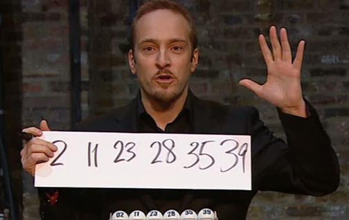英國電視臺現(xiàn)場直播了當(dāng)期彩票的開獎(jiǎng)過程,由機(jī)器隨機(jī)選擇箱子中的球。而在另一個(gè)演播室,放置了一臺電視播放開獎(jiǎng)過程。這位身處另一演播室的神秘“幻術(shù)師”在結(jié)果出來之前,就背對電視寫下了一組數(shù)字,分別是2、11、23、28、35和39。結(jié)果證實(shí),他所預(yù)測的數(shù)字與中獎(jiǎng)結(jié)果完全一致,令人瞠目結(jié)舌。