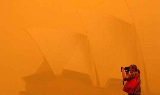 澳洲東部星期三遭遇數(shù)十年來最嚴(yán)重的沙塵暴,悉尼市被覆蓋,交通受阻。強風(fēng)把數(shù)以噸計的紅色沙塵傾倒在澳洲最大城市悉尼,使悉尼覆蓋在怪異的赤色迷霧中,著名悉尼歌劇院被涂上一層厚厚的沙塵。