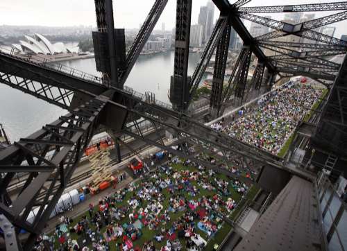 據(jù)香港大公網(wǎng)報(bào)道,當(dāng)?shù)谝豢|陽光照射在悉尼港大橋上時(shí),等待已久的人們井然有序地開始從北岸上橋。他們有的全家出動(dòng),有的呼朋結(jié)伴,有的老人甚至坐著輪椅趕來。在大橋的入口處,一些音樂家在演奏,為早餐會(huì)助興。組織者還特地從農(nóng)場運(yùn)過來十多頭奶牛,為來賓現(xiàn)場擠牛奶。