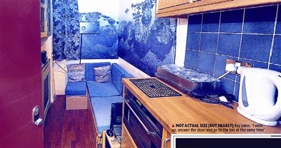 家中雖小,但家具和設備一應俱全,有沙發(fā)床、衣柜、廚具等等,狹小的洗手間被巴克改成了迷你浴室,不用洗澡時,這個浴室就是一個衣柜,可以掛衣服。開放式廚房也設在客廳內(nèi),與沙發(fā)床緊貼。