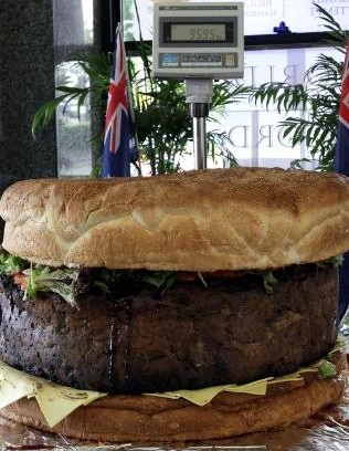 據(jù)報道,這個漢堡包總共重將近100公斤,打破了由美國密歇根州84公斤漢堡包創(chuàng)下的紀(jì)錄。