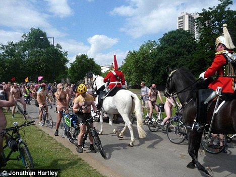 他們在行徑到倫敦海德公園時與這些皇家騎警不期而遇。身著華麗服飾,裝備奢華的士兵們騎著高大的駿馬在這些“一絲不掛”的騎車人中踱步,場面好不尷尬。
