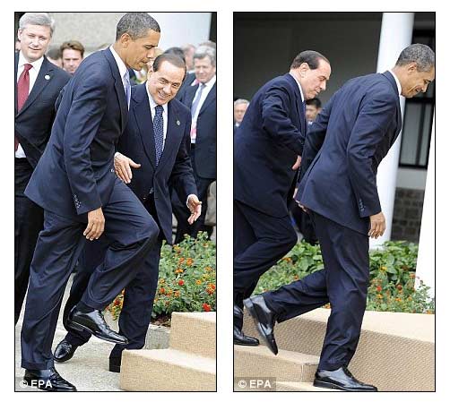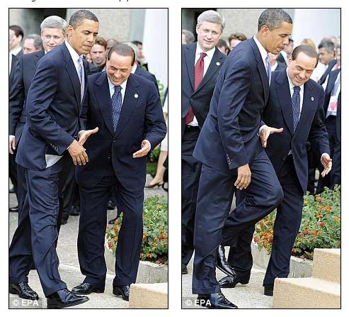 據(jù)英國《每日郵報》7月9日報道,作為G8峰會上的重量級人物,奧巴馬的到來讓意大利總理貝盧斯科尼喜出望外。然而這次貝氏可謂是“熱臉貼上了冷屁股”,他滿臉堆笑地伸出手,要和奧巴馬握手,但對方卻對他“視而不見”,直接從他前面走過。