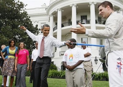 中新網(wǎng)9月17日電 綜合媒體報道,奧巴馬16日在白宮南草坪“耍劍”,他還與曾在北京奧運會擊劍項目中獲得銀牌的莫豪斯較量起來。