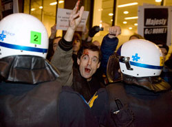 示威人群揮舞著鳶尾花旗(fleur-de-lis,波旁王朝復(fù)辟時,王室使用的旗幟),大喊口號,扔雞蛋抗議。有的示威者坐在街道中間,導(dǎo)致查爾斯原定參加的出席儀式被迫取消。