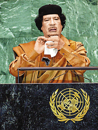 但對(duì)于一名與會(huì)者,這熱鬧早在他抵達(dá)紐約之前的一個(gè)月就已經(jīng)開(kāi)始了,這個(gè)人就是利比亞領(lǐng)導(dǎo)人卡扎菲?ㄔ平^對(duì)不乏制造熱鬧的資本,他頭上并沒(méi)有頂著總統(tǒng)或總理的頭銜,人們常常用他的軍中官銜上校來(lái)稱(chēng)呼他,但他卻是利比亞的實(shí)權(quán)領(lǐng)袖。