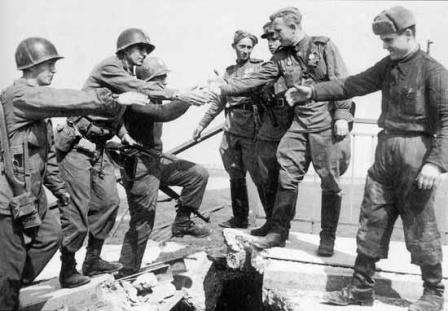 1945年4月25日,一支美軍偵察隊(duì)與一隊(duì)蘇軍在德國城市托爾高(Torgau)南部易北河畔的一座橋上勝利會(huì)師,一幅美蘇兩軍士兵握手的照片從此傳遍世界,成為反法西斯戰(zhàn)爭歐洲戰(zhàn)場出現(xiàn)勝利曙光,希特勒政權(quán)即將滅亡的最廣為人知的象征之一。
