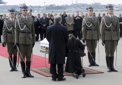 卡欽斯基的靈柩11日由一架波軍直升機(jī)從撞機(jī)地點(diǎn)俄羅斯斯摩棱斯克運(yùn)返波蘭首都華沙,代理總統(tǒng)科莫羅夫斯基、總理圖斯克等官員在場(chǎng)迎接,以一場(chǎng)簡(jiǎn)短的宗教儀式向其致祭。靈柩將會(huì)由軍隊(duì)護(hù)送到總統(tǒng)府,稍后,當(dāng)局將會(huì)把總統(tǒng)府開放,讓民眾進(jìn)入瞻仰卡欽斯基的遺容。