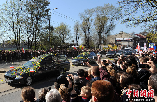 卡欽斯基夫婦的遺體昨日早上從首都華沙,運(yùn)抵克拉科夫,當(dāng)靈車緩慢駛過時,道路兩旁的民眾獻(xiàn)上鮮花致敬。于當(dāng)?shù)貢r間下午2時,在汽笛和教堂鐘聲之下,圣母大教堂的葬禮正式展開,在教堂外,數(shù)以萬計(jì)的波蘭人民聚集,透過大銀幕上的直播參與葬禮。其后,卡欽斯基夫婦的棺木被運(yùn)往瓦維爾宮,接受21響禮炮致敬和安葬,與多位帝王英雄同葬一地。