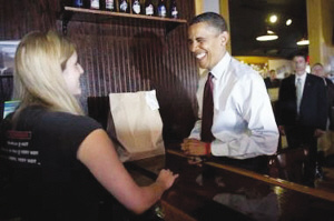 據(jù)法新社消息,美國總統(tǒng)奧巴馬13日在紐約州布法羅時(shí),突然造訪當(dāng)?shù)匾患乙猿鍪邸八3抢彪u翅”而聞名的小吃店。一名女店員由于見到奧巴馬過度緊張和興奮,竟一時(shí)口誤,用了極其不雅的詞匯稱贊奧巴馬是“帥哥”。
