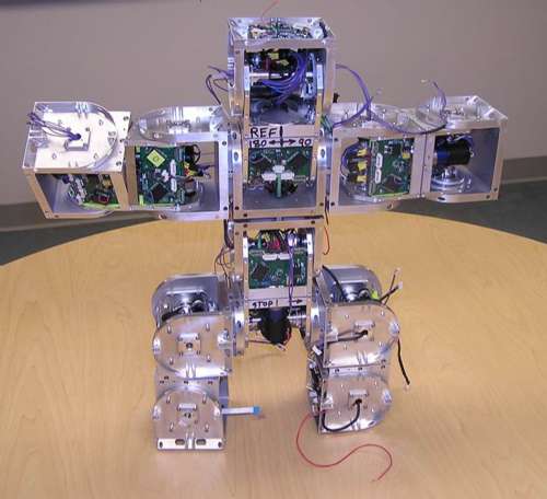 南加州大學(xué)多形態(tài)機(jī)器人學(xué)實(shí)驗(yàn)室兩年多前開始研發(fā)這款“超級機(jī)械人”(Superbot)。它是由一百塊模塊組成,目前僅完成了頭二十塊。它雖然不能真的像《變形金剛》電影中的機(jī)械人那樣變成貨車或“F-22”戰(zhàn)斗機(jī),但它的變身能力仍令人咋舌:它可以“長出”一對、兩對或三對“腿子”,可以像蛇那樣滑行,也可以像毛蟲那樣蠕動(dòng)。其中六塊模塊可以形成履帶,有些組合還可以舞動(dòng)繩子。研究主管沈偉明(音譯)稱:“它要攀爬時(shí)可以長出腿子,要下山時(shí)則可以變成球狀或者索性滾下去!迸c賓夕法尼亞大學(xué)去年展出的模塊機(jī)械人相似,它解體后能夠自我修復(fù)和自我重裝:每個(gè)模塊儼如一個(gè)獨(dú)立的機(jī)械人,而且可以利用紅外線和無線電訊息互相“對話”;它們又會(huì)一直評估周遭情況,包括附近有沒有其它模塊,以及它們本身是否需要變成手腳。