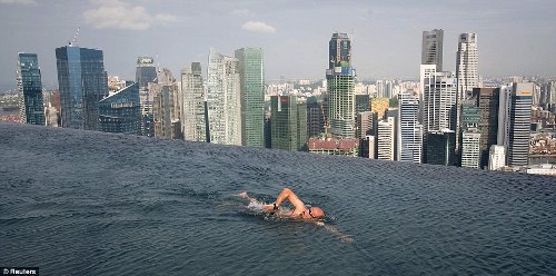報道稱,建在樓頂?shù)挠境乜雌饋砣缤嫜由斓降仄骄一般壯觀。你可以一邊游泳,一邊俯瞰新加坡靚麗的城市風(fēng)光。從泳池溢出的水會滲入到特別設(shè)計的集水區(qū),并通過水泵和水處理系統(tǒng)重新回到泳池中。