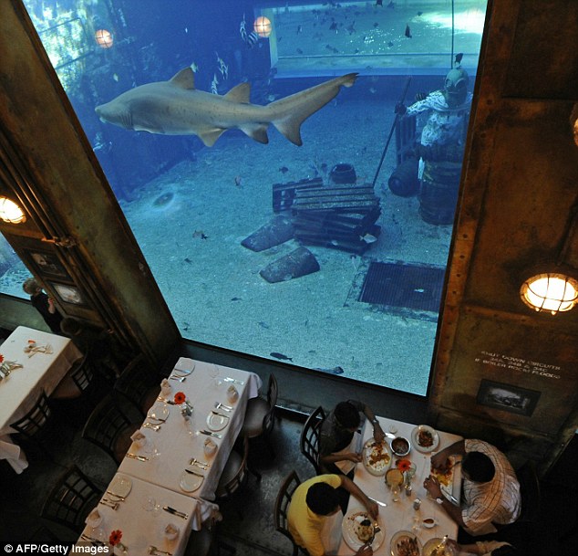 當(dāng)你在船尾這家涼爽昏暗的角落,大嚼著生猛海鮮,這家海洋樂園著名的鯊魚,會從你就餐的窗戶外遨游而過。