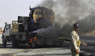 中新網(wǎng)8月31日電 綜合外電報(bào)道,巴基斯坦為駐阿富汗北約部隊(duì)運(yùn)送物資的補(bǔ)給車和油罐車30日晚在巴阿邊境遭到可疑武裝分子襲擊,至少20輛車被燒毀,2人受傷。