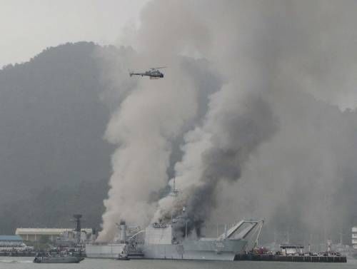 這也是該軍艦第二次發(fā)生大火;2002年,它也在同一地點遭大火狂燒。根據(jù)觀察火勢的猛烈程度,這次遭受破壞的程度比之前嚴重。
