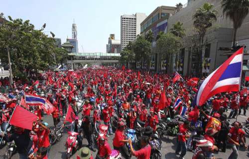 紅衫軍在旅游熱點四面佛附近架起講臺集會,他們站滿馬路、天橋和百貨公司前的廣場,領(lǐng)袖揚言徹夜示威,直至重新大選。