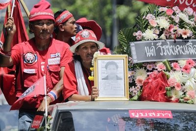 紅衫軍一名領導人稱,他們抬著11個棺材進行游行,里面放著死于周六暴力沖突的喪生者遺體。泰國政府部門稱,當天有4名軍人和17名平民死亡,政府周一將對9具尸體進行尸檢。
