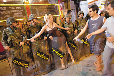 數(shù)以百計(jì)的士兵配備了M-16機(jī)關(guān)槍,在商業(yè)區(qū)中心地帶Silom路進(jìn)行巡邏,密切關(guān)注路口對(duì)面的示威者動(dòng)向,那些示威者已經(jīng)集結(jié)了鋒利的竹杖,用卡車輪胎搭起路障。