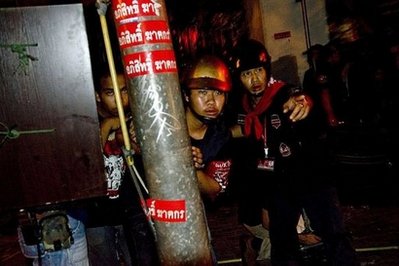 泰國軍隊(duì)19日清晨進(jìn)駐曼谷市是隆路(Silom)后,紅衫軍這三天來緊守拉差帕頌路口(Ratchaprasong)鬧區(qū)示威地點(diǎn),并運(yùn)來大批竹子、輪胎、網(wǎng)子圍住示威地點(diǎn)路口,與是隆路就隔著一條馬路,緊張氣氛每天都在升高,軍隊(duì)將展開鎮(zhèn)壓的傳聞越來越多。