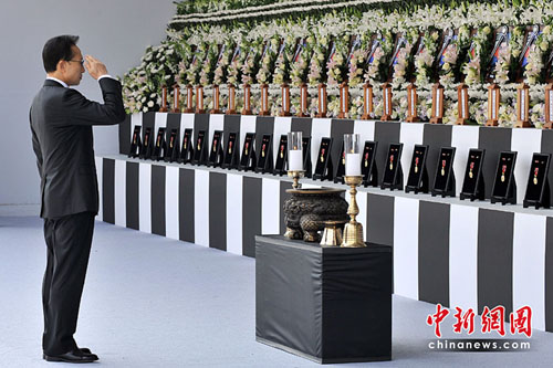 當(dāng)天的遺體告別儀式以對犧牲官兵的敬禮和默哀開始,然后向46名為國獻身的官兵追封花郎武功勛章。之后,韓國海軍總參謀長金盛贊朗讀吊唁詞,天安艦甲板副士官金玄來(音)朗讀了追悼詞。