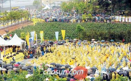據(jù)報道,當(dāng)天,在舉行盧武鉉逝世一周年追悼儀式的峰下村,大雨如注,然而前來追悼的客人仍然絡(luò)繹不絕。