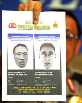 這兩張畫(huà)像是以在爆炸現(xiàn)場(chǎng)發(fā)現(xiàn)的兩顆遭嚴(yán)重?fù)p毀的頭顱為依據(jù)制作出來(lái)的。印尼警方發(fā)言人稱,“我們?cè)诒ǖ攸c(diǎn)發(fā)現(xiàn)了兩顆遭嚴(yán)重?fù)p毀的頭顱,而且我們肯定他們就是自殺式人彈的嫌疑人!