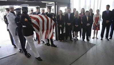 肯尼迪家族發(fā)言人表示,愛德華的遺體27日由寓所運(yùn)到波士頓的約翰-肯尼迪圖書館,需時(shí)至少兩個(gè)小時(shí),途中經(jīng)過多個(gè)對(duì)愛德華有重要意義的地方,周五開放給公眾瞻仰,翌日將安葬于阿靈頓國(guó)家公墓,毗鄰他的胞兄約翰和羅伯特的墓地。