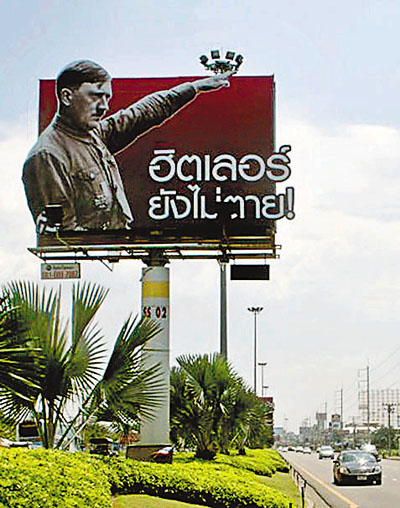 據(jù)悉,希特勒廣告牌于兩周前豎起,是為當(dāng)?shù)芈芬讏D索蠟像館下月開張做的宣傳。該廣告牌位于進(jìn)入芭堤雅的主要高速路旁,希特勒的畫像與廣告牌上的泰文廣告語(yǔ)“希特勒未死“十分醒目。廣告牌豎起以來(lái),泰國(guó)方面已經(jīng)接到100多宗投訴和德國(guó)、以色列等國(guó)大使館的抗議信。