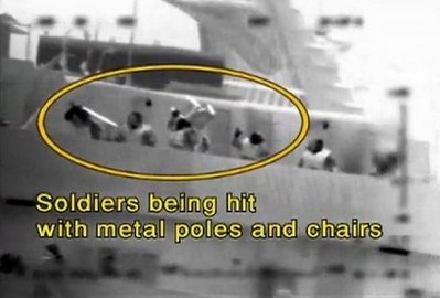 以軍發(fā)布長1分鐘的紅外線錄影片段,并配上英文字幕上載至YouTube網(wǎng)站。片段可見,當(dāng)首名士兵從直升機游繩而下,甫踏足土耳其救援船“馬維.馬爾馬拉號”甲板之際,一名船員便向他投擲閃光彈,甲板上的人紛找掩護或伏在地上。這時候,有船員抓住以軍的繩子搖晃,一名士兵似脫手掉下。他們又把繩子縛在甲板,企圖扯下直升機。降落甲板計程車兵遭佩戴防毒面具的船員攻擊。字幕稱:“士兵遭人以金屬棒和椅子毆打!贝瑔T又企圖搶奪士兵的武器,一名士兵更被多名船員合力抓住雙腿,從甲板拋下!