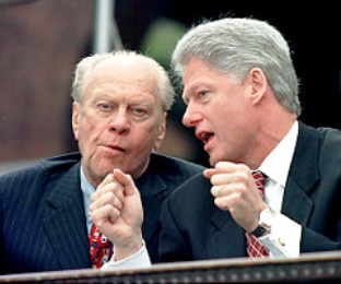 福特夫婦1993年首次與克林頓夫婦見面,他們當時邀請新的第一家庭至他們科羅拉多的家中作客。福特對克林頓的印象好壞參半,他認為克林頓很有個人魅力、說話準確、善于推銷,是他所見過的最好的政治家,甚至要比肯尼迪總統(tǒng)都強,但他認為克林頓在外交政策方面很弱。福特還感到克林頓沒有吸取他個人生活的錯誤,有關(guān)他風(fēng)流行為的傳聞在他進行總統(tǒng)競選活動時一直困擾著他。福特稱,他得出這樣的結(jié)論是出于他對克林頓夫婦的觀察,他曾邀請克林頓夫婦在科羅拉多度周末。他后來說:“我可以告訴你一件事:他不放過社交場合的任何一位漂亮女士。我可以告訴你,他一直色迷迷的。貝蒂有著同樣的印象,他毫不掩飾自己的興趣!