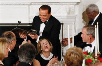 中新網(wǎng)10月16日電 據(jù)美聯(lián)社報(bào)道,意大利總理貝盧斯科尼13日晚上在白宮做客時(shí)鬧出笑話,他不小心撞壞演講臺(tái),他不得不手扶演講臺(tái)完成祝酒辭,讓在座的人士大笑。