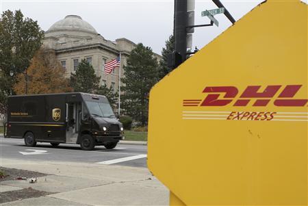 11月11日,美國維明頓,一輛UPS運(yùn)送車駛過一個DHL投遞箱。