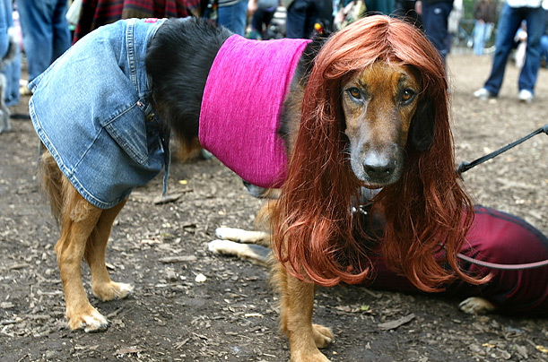圖片十三:在紐約城湯普金斯廣場(chǎng)公園舉行的萬(wàn)圣節(jié)小狗大游行中,大狗羅西頭戴金紅色長(zhǎng)發(fā),上身穿著迷你裹胸,下身著迷你牛仔裙,打扮成一個(gè)性感少女的模樣,吸引了眾多的目光。(鐘巖)