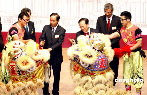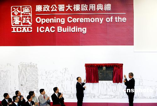 香港廉政公署新大樓十二月八日揭幕,中國最高人民檢察院檢察長賈春旺和行政長官曾蔭權(quán)出席開幕典禮。曾蔭權(quán)在開幕禮時表示,廉署成立30多年來,都致力維持本港重要核心價值,對貪污作出“零”容忍。他相信,廉署人員會繼續(xù)無畏和不偏不依,為香港服務(wù)。曾蔭權(quán)與廉署專員湯顯明主持揭幕禮。 中新社發(fā) 王麗南 攝