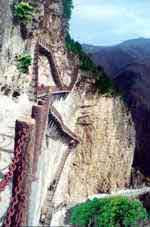 通天云衢:鐵索嶺上古建筑星羅棋布,山嶺巍峨,曠谷老松。綿綿黛色賞心悅目,但是從古至今鐵索嶺上下只有通過鐵索,很多老弱者不能成行,游人只能抱憾而去。為彌補此不足,三佳綿山投資開發(fā)者閻吉英先生于此山壁上建“之”字形天梯一座。天梯依山懸空縱橫盤亙而成,共計440多個臺階,全長300余米,如龍駕祥云,氣勢雄偉,堪稱精品。春日登此棧道,觀谷中山花競放,鶯轉(zhuǎn)鸝鳴,微風(fēng)拂過發(fā)鬢,寵辱皆忘,心曠神怡。夏日登此棧道,看對山松柏蒼翠,山巒如黛,常有彩虹從溝間騰起,雖有游人不同心情千種萬種,看此景,只會感到聳峰茂林充盈神心。秋日的綿綿薄霧如白絮飄飛,云隨風(fēng)飄,風(fēng)隨云轉(zhuǎn),姹紫嫣紅的山嶺,時顯時沒。冬日雪落棧道云衢,蒼蒼茫茫,山接天,天連山,“大雪壓青松,青松挺且直,”只覺若谷虛懷之外的自己頂天立地。雪霽,金光灑滿山嶺,湛藍的天,一覽無余,畫中的您,只能用詩來喻。無論何時行于此棧道上,塵勞頓無,飄然欲仙。