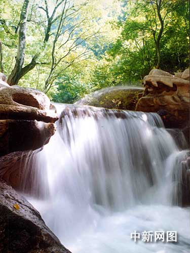 又往前走一點,是一道天然的小瀑布,那朵朵撞擊在石塊上飛濺出的銀白的水花,如霧如煙,雖沒有“飛流直下三千尺”的磅礴氣勢,卻給人一種柔和、幽雅的感覺。瀑布在歡唱,表露著它那按不住的歡樂。