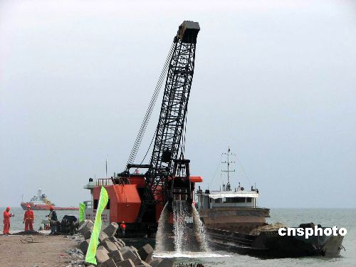 12月24日上午10時(shí),“南海一號(hào)”靠近碼頭,直至當(dāng)日下午4時(shí)沒有前進(jìn),登陸時(shí)間不能確定,挖沙船正在岸邊清理航道。中新社發(fā) 索有為 攝