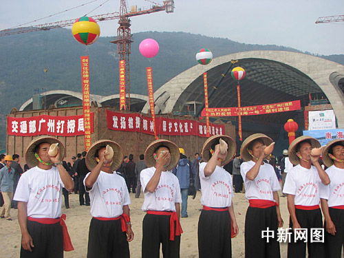 漁民吹起螺號歡送南海一號進館。