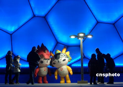 眾多民眾前來觀賽與福娃一起與水立方親密接觸。中新社發(fā) 廖攀 攝