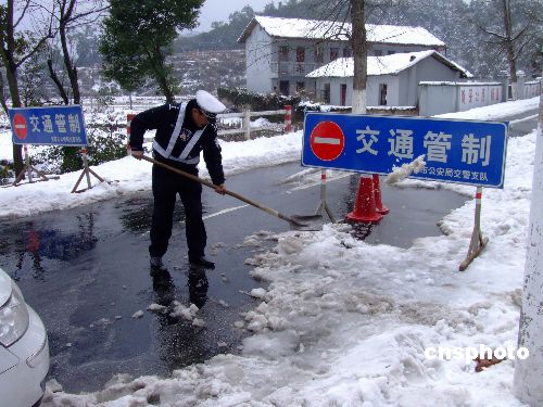 圖:江西宜溫公路因冰雪關閉 交警全力疏導交通