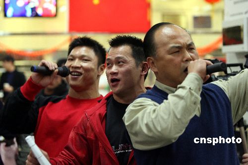 圖為中國男子舉重隊總教練陳文斌(右)和奧運會冠軍張國政(中)、世界冠軍李宏利(左)一起歡歌過除夕。
