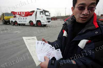 楊先生回憶說(shuō),昨天凌晨2時(shí),他的貨車(chē)突然壞在北苑路上,被巡邏的交通隊(duì)發(fā)現(xiàn),并撥打了新通拖車(chē)公司電話(huà)。新通公司來(lái)后把掛鉤掛在楊先生的車(chē)上,并告訴他:“拖車(chē)出場(chǎng)費(fèi)是6000元,掛上你的車(chē)就要5000元,另外每公里收費(fèi)一百元!薄皼](méi)想到車(chē)還沒(méi)拖就得交11000元,我當(dāng)時(shí)就不想拖了,可對(duì)方告訴我,拖車(chē)是他們的責(zé)任,而且鉤子已經(jīng)掛上了我的車(chē),就算不拖了還是要交錢(qián)!睏钕壬鷼鈶嵉卣f(shuō)。昨天早上6點(diǎn)左右,新通公司將楊先生的車(chē)拖到了位于豐臺(tái)的公司,除了出場(chǎng)費(fèi)、掛車(chē)費(fèi)和36公里的里程費(fèi)總共算下來(lái)一共要14600元。